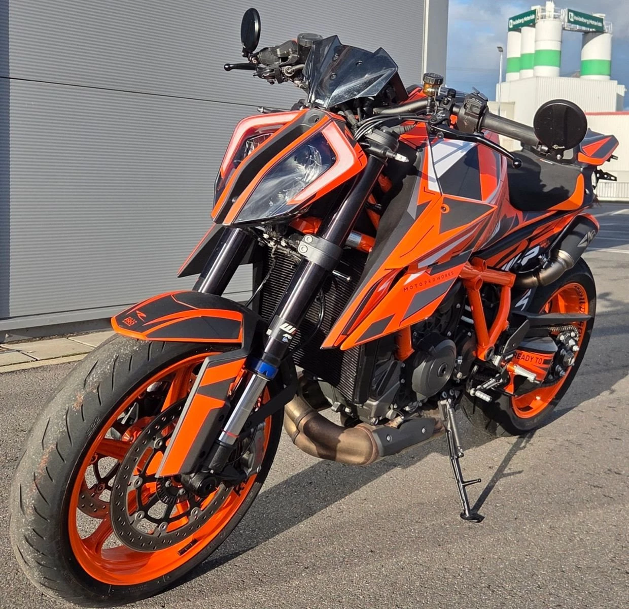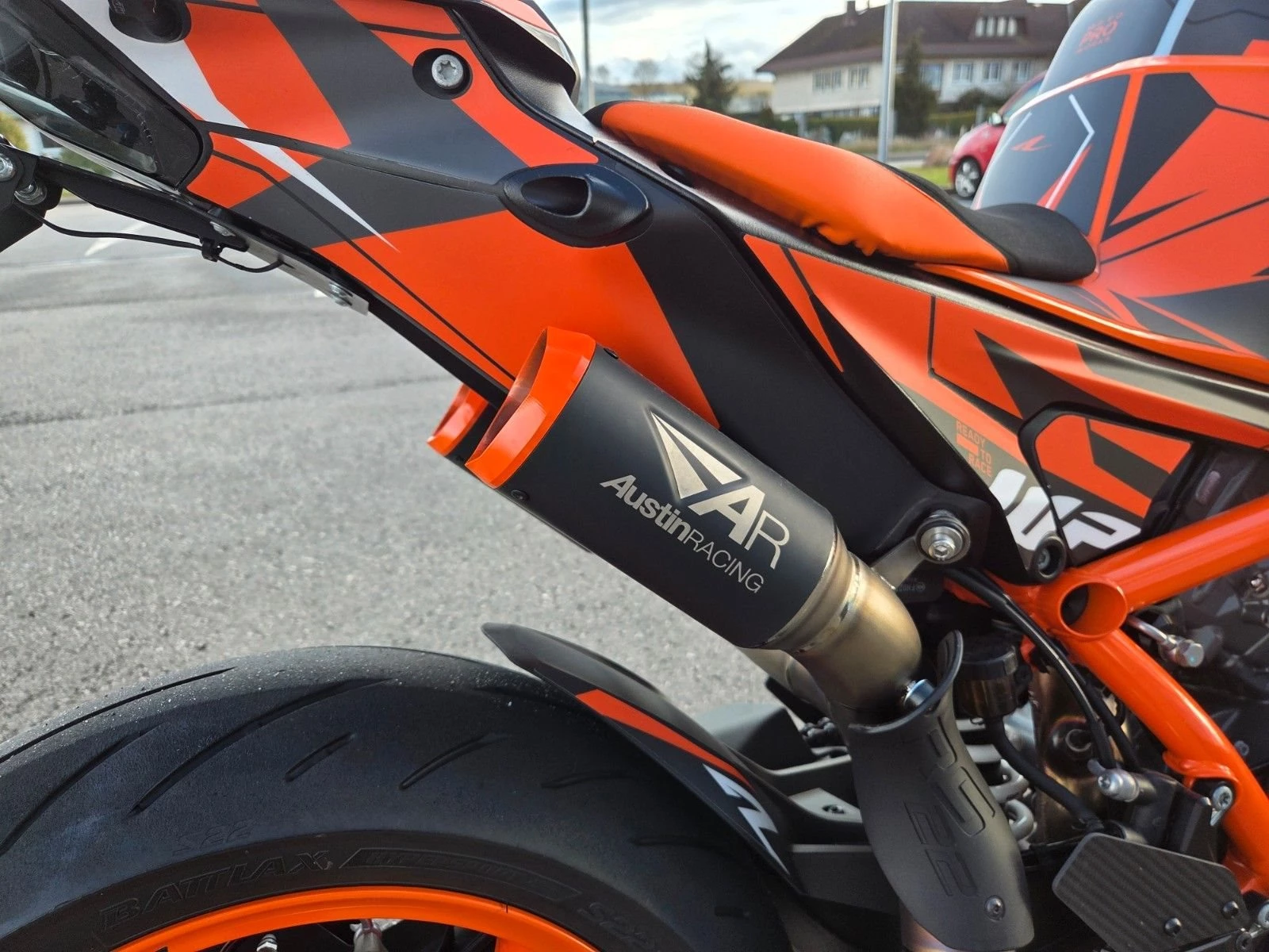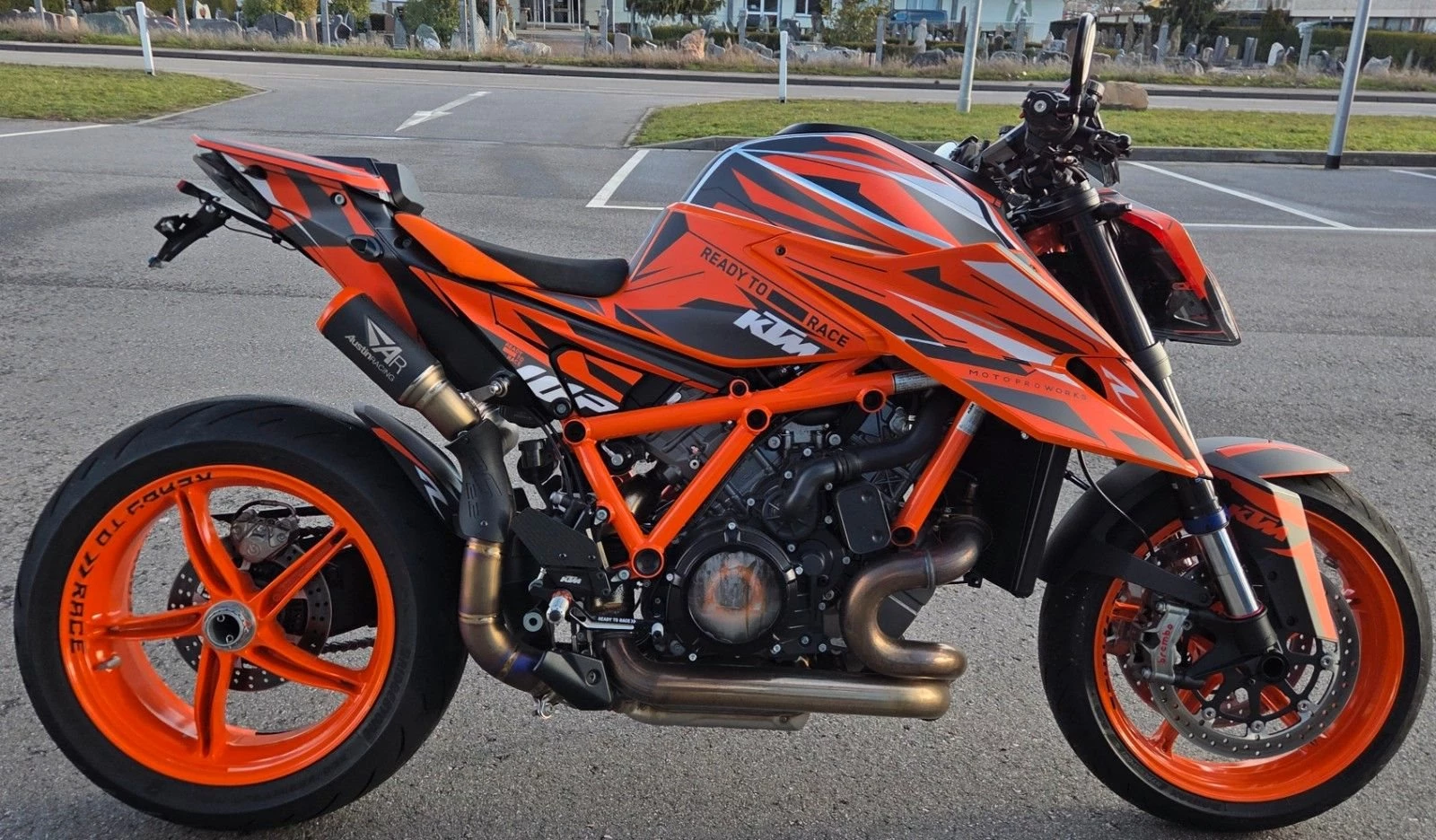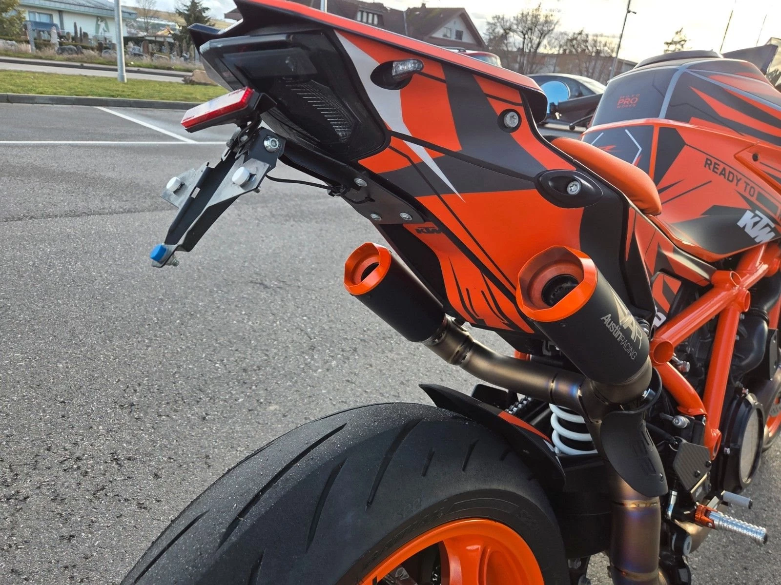 Austin Racing Auspuffanlage, Techpack, Factory Fußrastenanlage, Flyscreen, Tempomat, Motoproworks Dekorkit, Kurzer Kennzeichenhalter, KTM Mini Blinker vo./hi., Soziusabdeckung, Klarer Kupplungsdeckel, Lenkerendenspiegel, Powerpartssitz, Felgenaufkleber