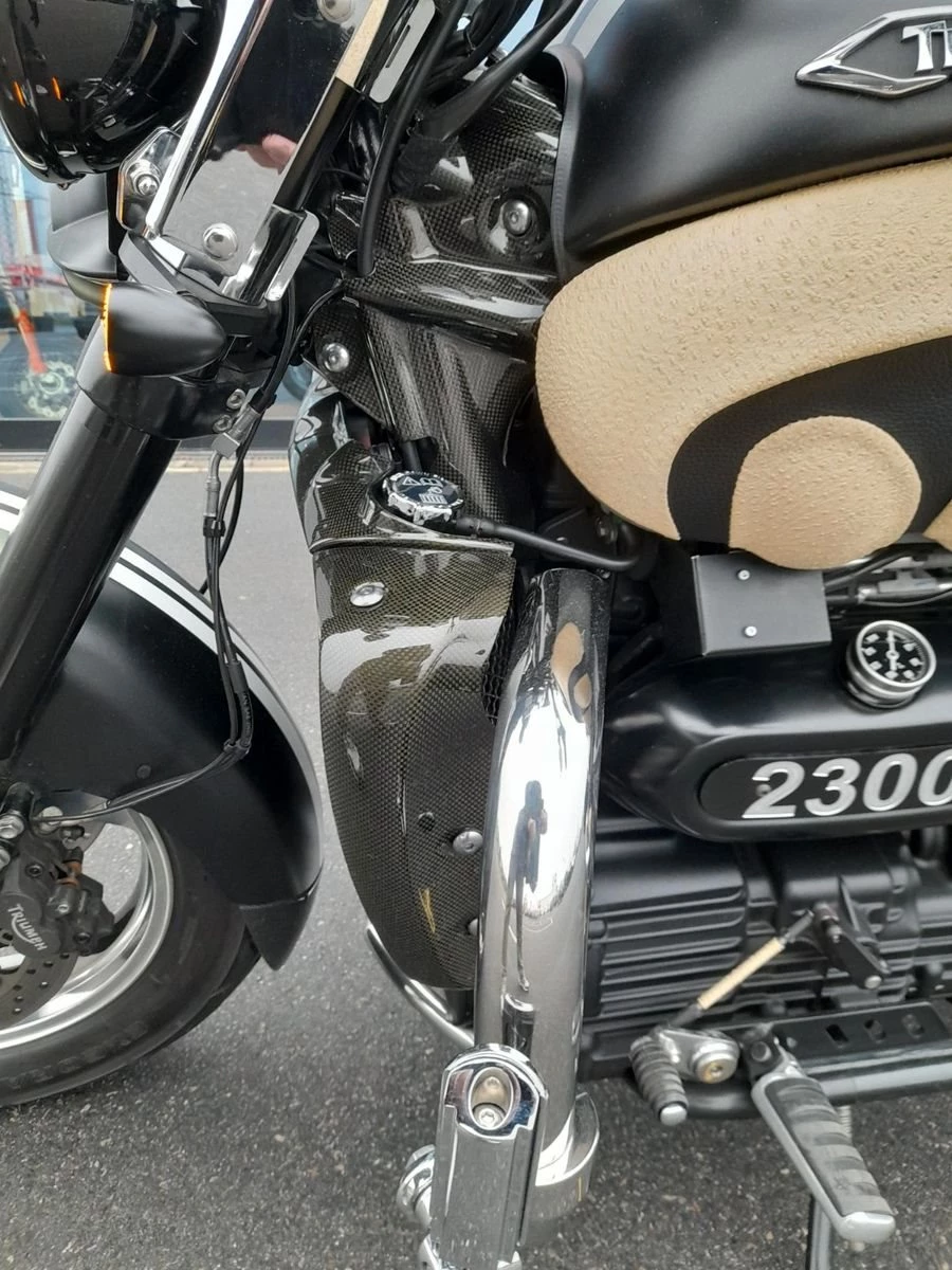 Hepco Becker Ledertaschen Ivory, Heizgriffe, Flyscreen, kurzer Kennzeichenhalter mit LED Rücklicht und LED Blinker, Fahrer Sissybar mit Gepäckbrücke und Ledertasche, Sturzbügel mit Ruherasten, Carbon Kühlerschutz, Carbon Gabelprotektoren, Carbon Rahmenschützer, Carbon Seitendeckel, Spiegel, Stahlflex Bremsleitungen, LED Scheinwerfer, vorverlegte Fussrasten, Offener Auspuff (Original dabei), Leder Design