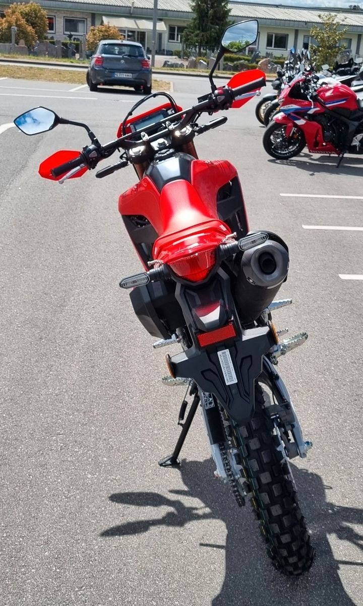 Die CRF300L ist dank neuem Rahmen und der konischen Aluminiumschwinge 4 kg leichter. Das macht sich auf der Straße und im Gelände vor allem beim Lenken bemerkbar. Der größere Hubraum des Einzylindermotors erzeugt zusätzliche 1,9 kW Leistung und ein um 4 Nm höheres Drehmoment - das spürt man beim Gas geben. Darüber hinaus verfügt die Maschine jetzt über eine Anti-Hopping-Kupplung. Die Bodenfreiheit wurde erhöht und die Fahrposition auf optimale Kontrolle abgestimmt. Der Tank ist schlank und die Kontur der komfortablen Sitzbank erleichtert das Abstützen auf dem Boden. Eine Ganganzeige im Cockpit und das aggressive Scheinwerferdesign verleihen der Maschine den letzten Schliff.