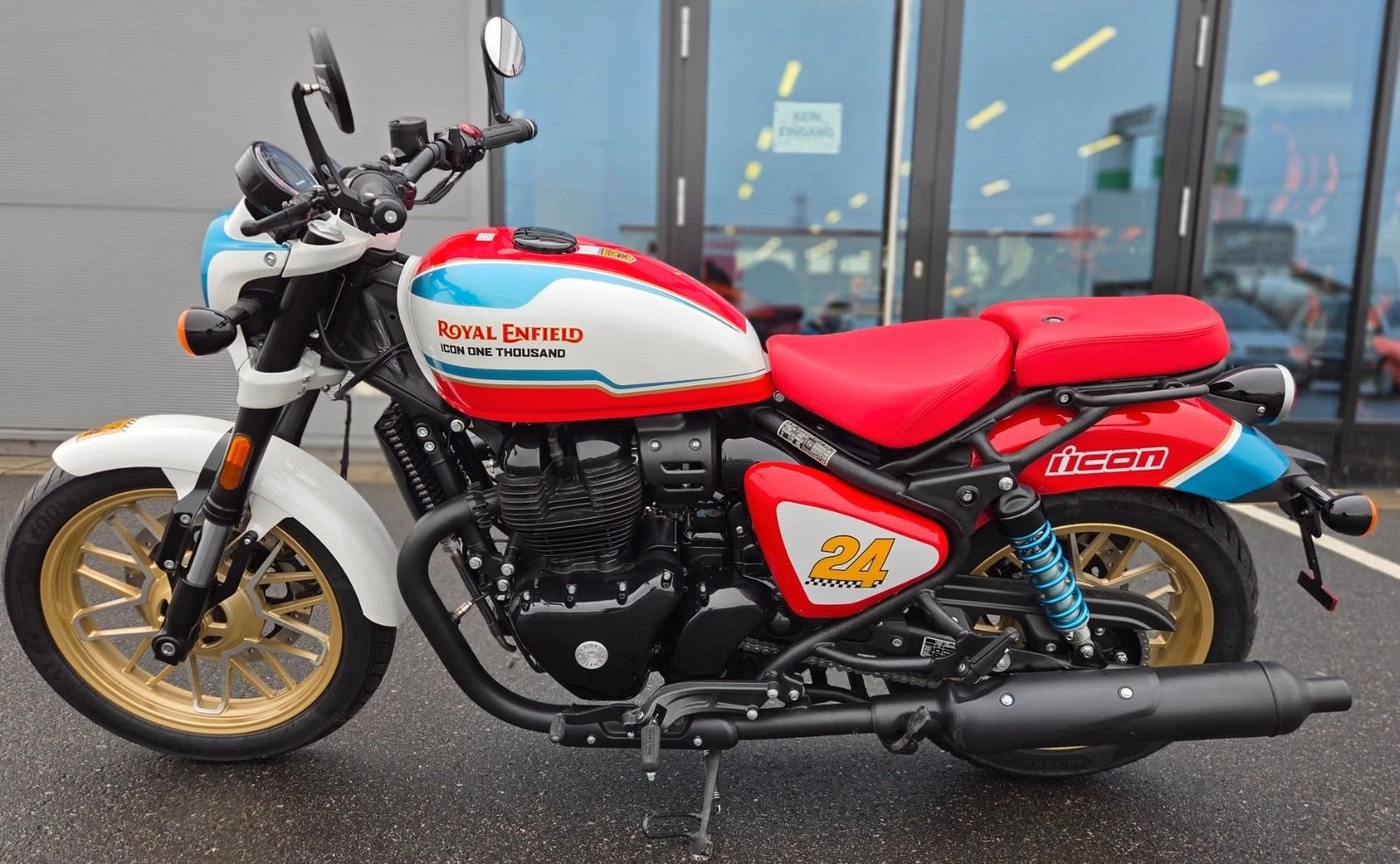 Die Royal Enfield Shotgun 650 Icon Edition, inspiriert vom "Always Something"-Custom-Bike von ICON Motosports, ist ein streng limitiertes Sondermodell (nur 100 Stück weltweit). Sie zeichnet sich durch eine 3-Ton-Lackierung, goldene Felgen, blaue Federn und einen roten Sitz aus. Die technische Basis bleibt der 648ccm-Zweizylinder.