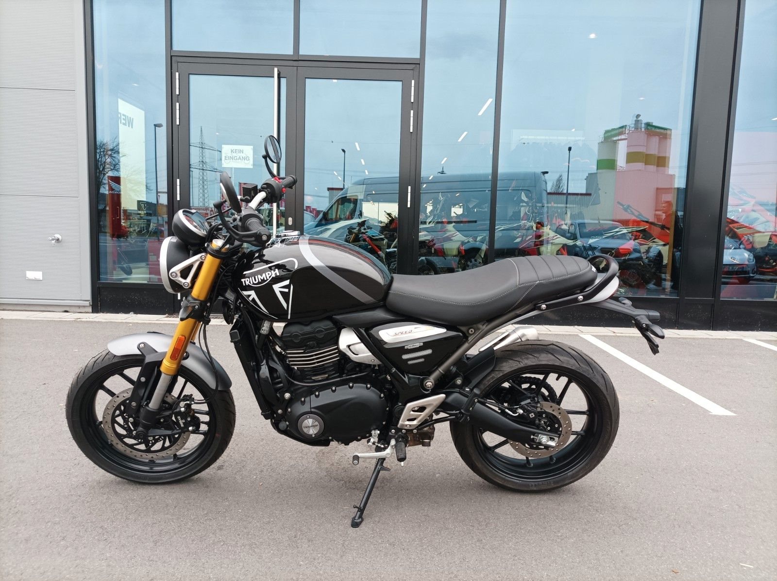 Der neue Einzylindermotor der TR-Serie wurde nach dem Vorbild legendärer Triumph-Motorräder aus der Vergangenheit entwickelt und mit modernsten Technologien ausgestattet, um eine voll nutzbare, charaktervolle Leistung mit spontanem Ansprechverhalten und erstklassiger Performance zu entfalten.Die Sitzposition ist neutral und vermittelt dabei ein mitreißendes Fahrerlebnis bei niedriger Sitzhöhe. In Kombination mit dem speziell abgestimmten Roadster-Fahrwerk, der hochwertigen Aufhängung und den erstklassigen Bremsen ergibt sich das für Triumph charakteristische, agile und souveräne Handling, mit dem Fahrer jeden Könnens die dynamische Performance der Speed 400 voll auskosten können.Die hervorragende Verarbeitung und die Liebe zum Detail, die jeden modernen Klassiker von Triumph auszeichnen, finden sich auch bei der Speed 400 wieder. Von den charakteristischen schwarz pulverbeschichteten Motorgehäusen bis hin zur satten Lackierung - die Speed 400 ist unverkennbar eine Triumph und ein echter moderner Klassiker.