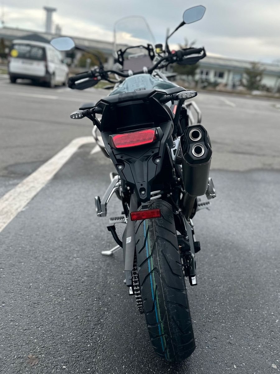 der Akrapovic-Schalldämpfer, das Showa-Fahrwerk mit langem Federweg und die Schutzbügel unterstreichen die Geländetauglichkeit.