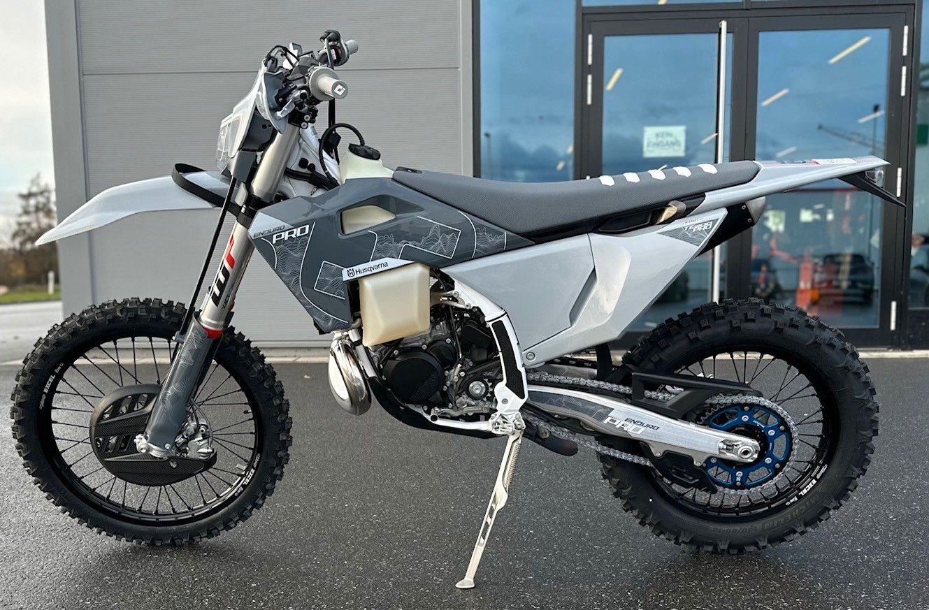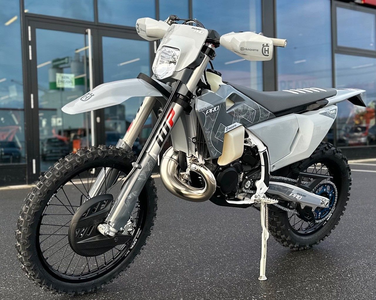 Mit ihrem unverwechselbaren Design und ihrer unübertroffenen Geländegängigkeit ist die TE 300 Pro der Inbegriff für pure 2-Takt-Enduro-Performance. Ihre überragenden Fahreigenschaften sind das Ergebnis der Kombination des renommierten Standardmodells mit einer umfangreichen Liste von technischem Zubehör. Der Factory Racing-Radsatz verleiht ihr Stärke und Stil, ebenso wie das Supersprox Stealth-Ritzel hinten, während ODI-Griffe mit weicher Mischung und ein Competition-Sitzbezug für maximalen Komfort und Kontrolle sorgen. Die Throttle Body Injection (TBI) liefert eine gleichmäßige, kontrollierbare Leistung, die mit dem intuitiven Kennfeldschalter angepasst werden kann. Rennerprobte und bewährte Komponenten von GALFER, Michelin, Twin Air und ProTaper vervollständigen den Aufbau dieser sehr begehrten Maschine.