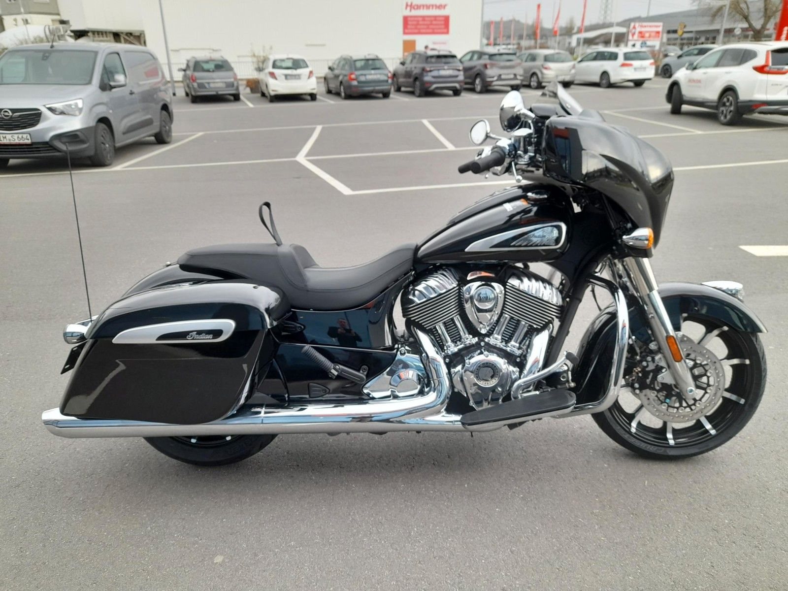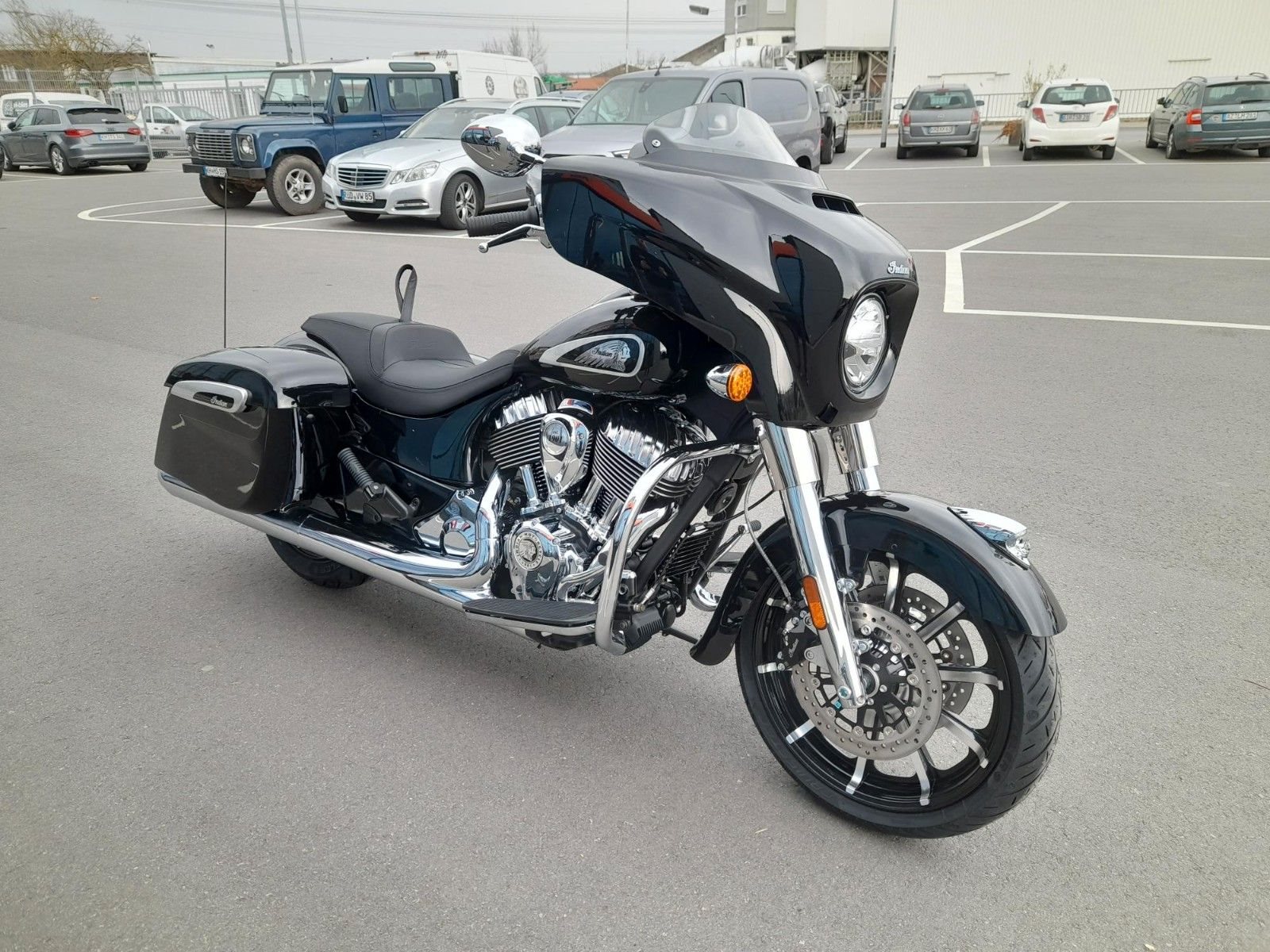 ERSTKLASSIGE AUSSTATTUNG Die Chieftain Limited ist serienmäßig mit LED-Beleuchtung, schlüsselloser Zündung, Tempomat, elektrisch verschließbaren Seitenkoffern, ABS und Reifendruckkontrolle ausgestattet. 7-Zoll-Touchscreen mit RIDE COMMAND inkl. Apple CarPlay-Integration; elektrische Windschutzscheibe; Highway Bars; Vinyl-Rogue-Sitz; Reifendrucküberwachung; fernbedienbare Hard Saddlebags; wählbare Fahrmodi; Deaktivierung des hinteren Zylinders; ABS; Tempomat; schlüssellose Zündung; 100-Watt-Audiosystem mit AM/FM, Bluetooth, USB, Smartphone-kompatiblem Eingang; 12-V-Ladeanschluss