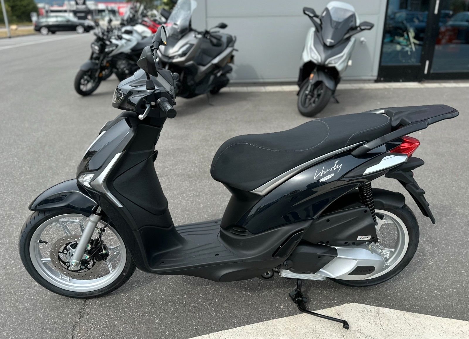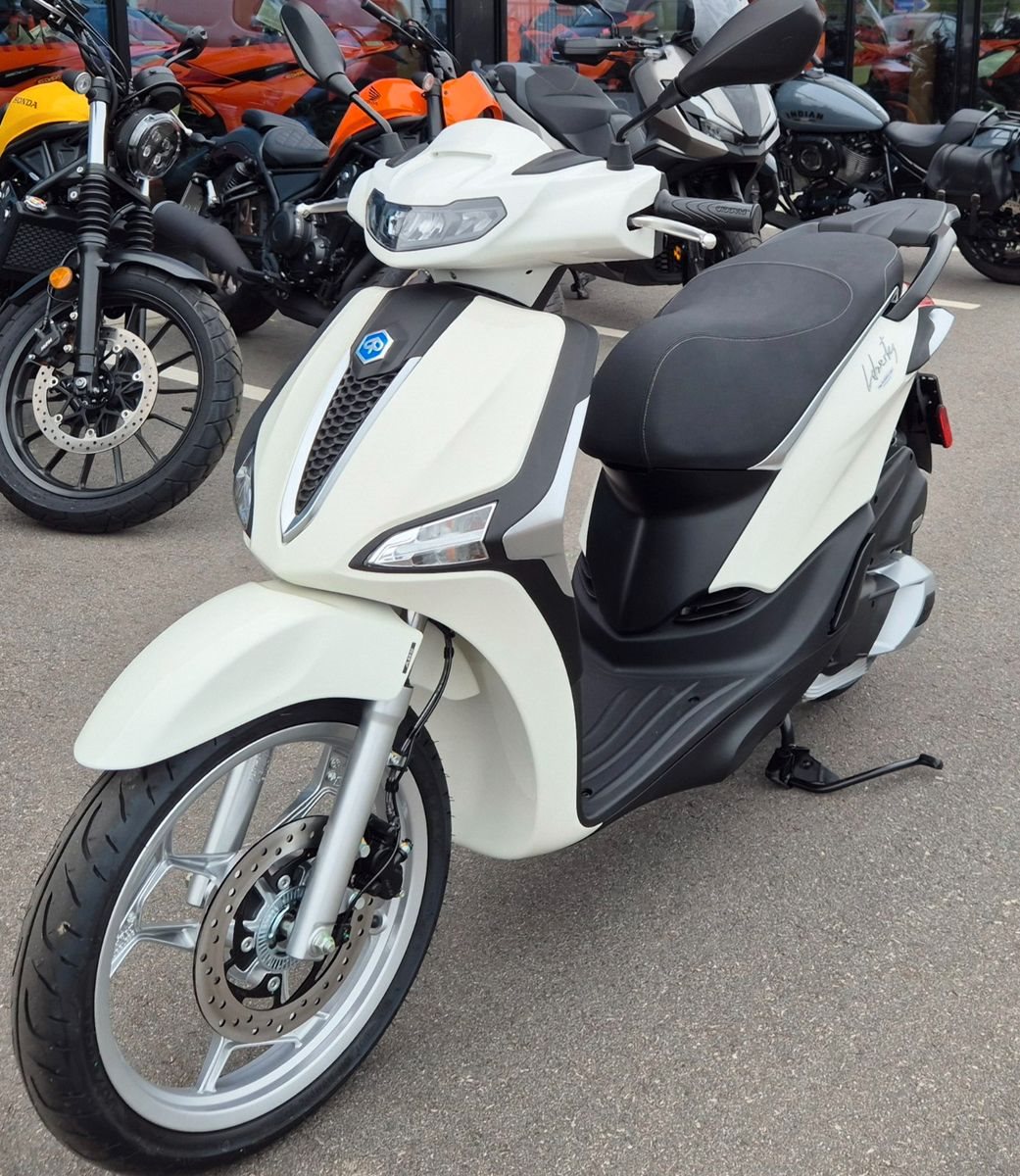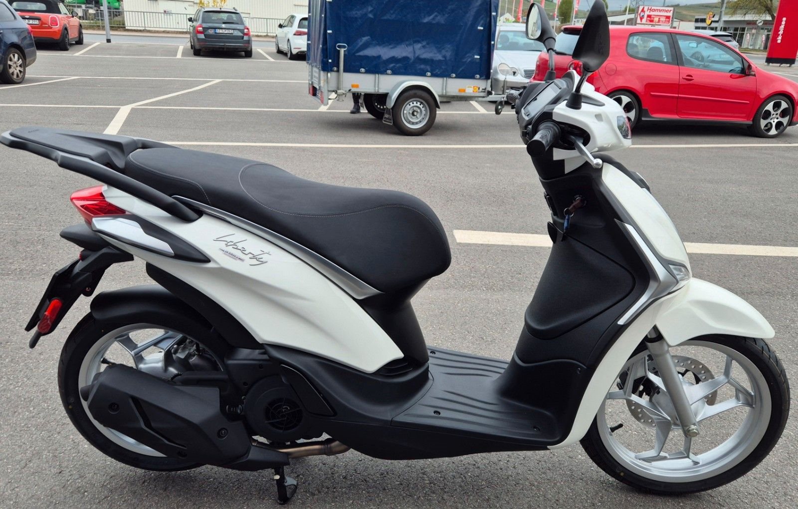 Das elegante und raffinierte Design des Piaggio Liberty fällt sofort ins Auge, insbesondere durch die "Krawatte" mit wabenförmigem Gitter, die eine starke Verbindung zur Piaggio-Designfamilie herstellt. Die kompakten und dynamischen Linien sorgen für ein perfektes Gleichgewicht zwischen der robusten Frontpartie und dem schlanken Heck, wo der Aluminium-Gepäckträger einen Hauch von Klasse und Kontinuität verleiht. Mattschwarze Details an Spiegeln, Auspuff und Gepäckträger fügen sich harmonisch mit den satinierten Akzenten an Felgen, Logo und Blinkern zusammen und verleihen dem Piaggio Liberty eine anspruchsvolle und moderne Ästhetik.
