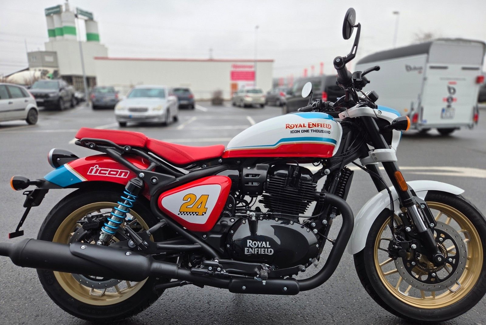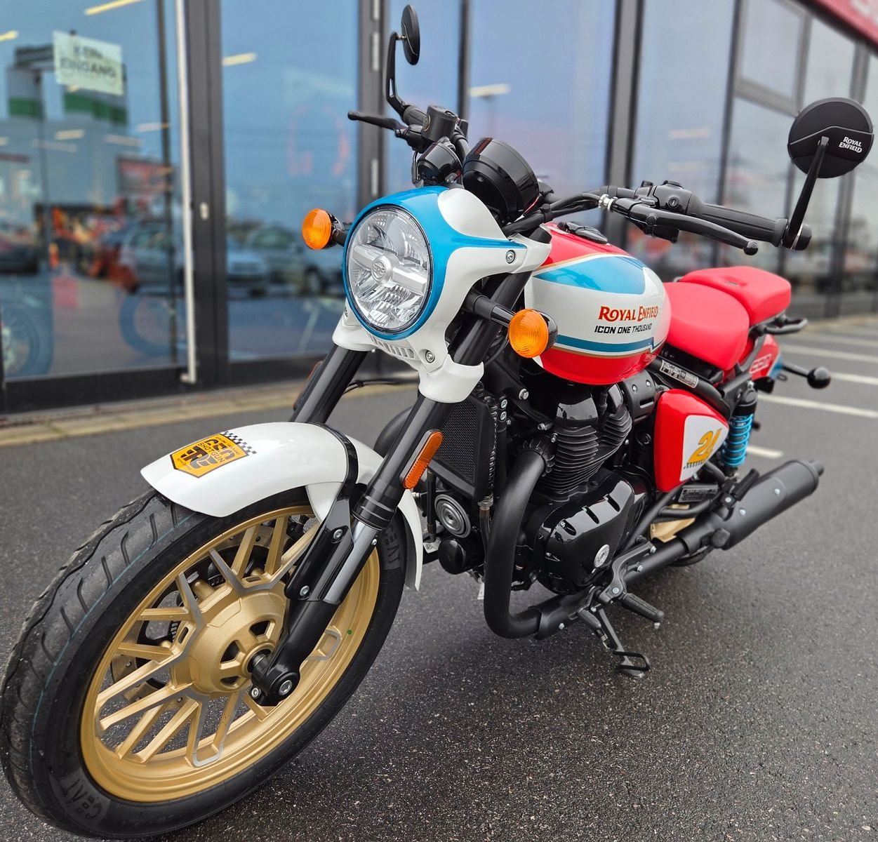Die Royal Enfield Shotgun 650 Icon Edition, inspiriert vom "Always Something"-Custom-Bike von ICON Motosports, ist ein streng limitiertes Sondermodell (nur 100 Stück weltweit). Sie zeichnet sich durch eine 3-Ton-Lackierung, goldene Felgen, blaue Federn und einen roten Sitz aus. Die technische Basis bleibt der 648ccm-Zweizylinder.