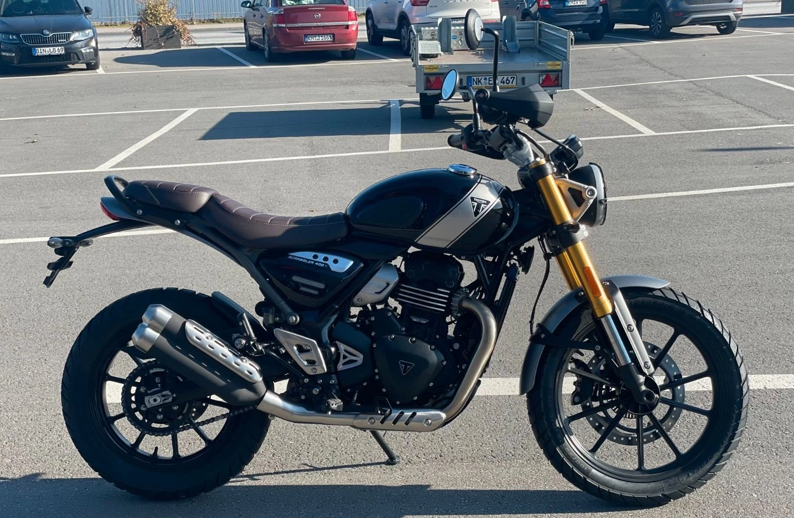 Die Scrambler 400 X ist ein erfrischender Neuzugang in der Scrambler-Familie von Triumph und eröffnet einer ganz neuen Generation das Fahrerlebnis der modernen Klassiker von Triumph.Mit ihrer zeitlosen Scrambler-Silhouette und der unverwechselbaren, gerippten Sitzbank bietet die Scrambler 400 X den unverkennbaren Stil einer Triumph, kombiniert mit hochwertiger Verarbeitung und erstklassiger Ausstattung voller moderner Fahrtechnologie.Der in Hinckley konstruierte Einzylindermotor erzeugt den für Triumph typischen charaktervollen und reaktionsschnellen Antrieb mit klassenbester Leistung und Drehmoment.Die souveräne Sitzposition mit breitem Lenker sorgt in Verbindung mit dem Scrambler-spezifischen Fahrwerk für Komfort auf der Straße und im Gelände.Die hochwertige Aufhängung mit 150 mm Federweg und der Doppelkolben-Bremssattel gewährleisten ein präzises, agiles und intuitives Handling und helfen sowohl neuen als auch erfahrenen Fahrern, das volle Potenzial der Scrambler 400 X voll auszuschöpfen.