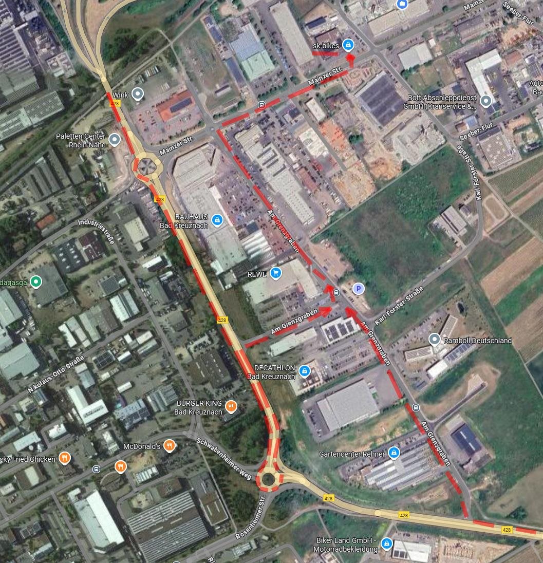 - Von der B 41 kann nicht direkt in die „Mainzer Straße“ abgebogen werden. Somit muss am zweiten Kreisel umgedreht und in die Straße „Am Grenzgraben“ rechts abgebogen werden. Nach dem Linksabbiegen an der Einmündung erreicht man die „Mainzer Straße“.